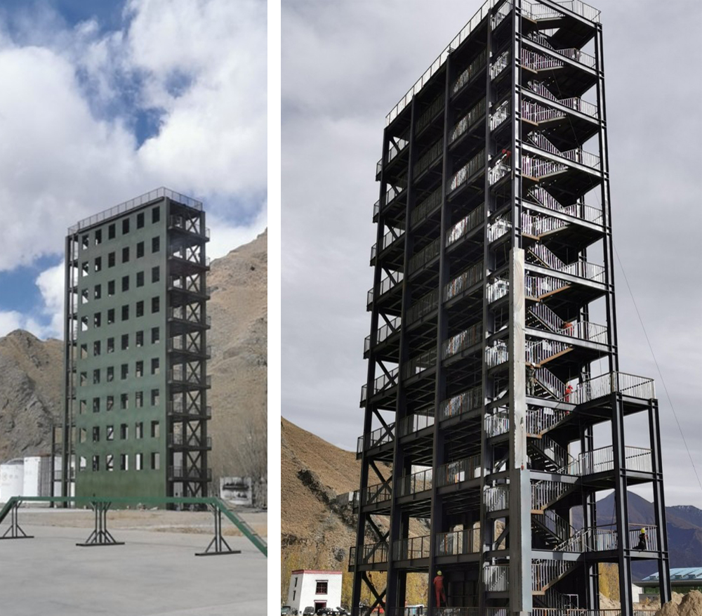 正天钢结构打造的消防总队训练塔以实战化需求为核心,采用六层钢架结构,总高度达21米,通过模块化设计还原居民楼复杂场景。塔内设置可启闭门窗、模拟坍塌通道、分隔密室等训练单元,结合真火浓烟系统,可模拟高温、黑暗、障碍物等极 端环境。训练塔配备热成像仪定位、绳索搜救等科技设备,帮助消防员在真实火场中快速识别危险路径、掌握破拆与门控技术。其设计兼顾安全性与功能性,为高原地区消防救援队伍提供了专业化训练平台,显著提升了队员在复杂环境下的应急处置能力。